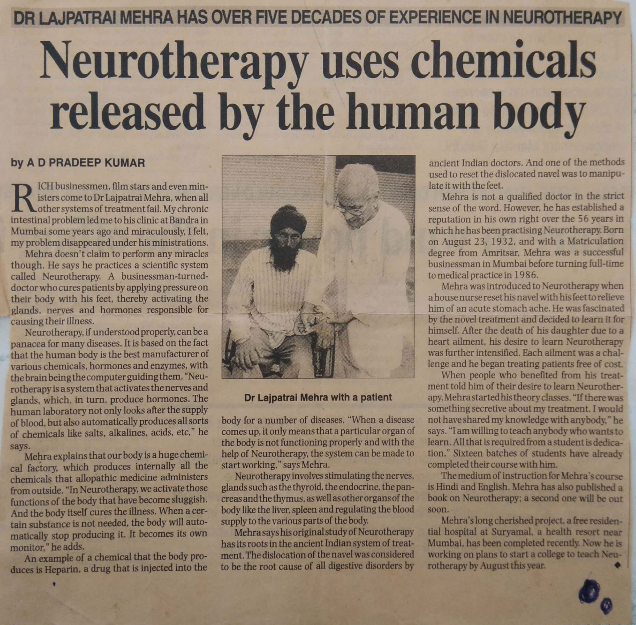 Mehra doesn’t claim to perform any miracles though. He says he practices a scientific system called Neurotherapy. A businessman-turned-doctor who cures patients by applying pressure on their body with his feet, thereby activating the glands, nerves and hormones responsible for causing their illness.